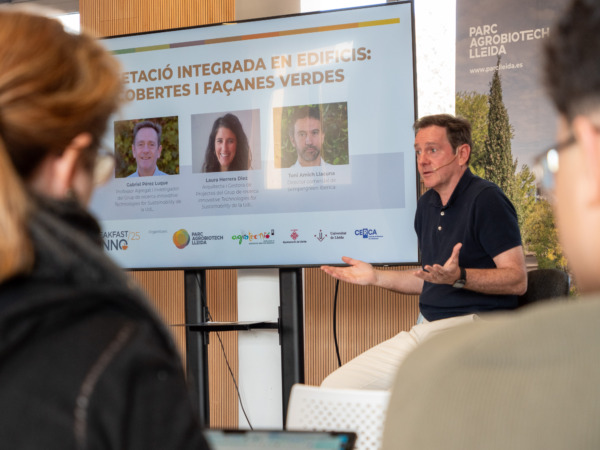 Breakfast4Inno innovation breakfast, organized monthly by Agrotecnio and the Agrobiotech Park. The University of Lleida (UdL) is a leader in Spain in research aimed at promoting urban re-naturalization through the integration of vegetation in buildings. Green walls and roofs, known as BIG systems (