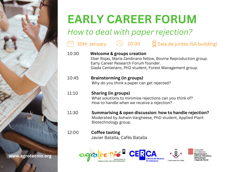 En 2024, Agrotecnio recupera l’organització dels fòrums enfocats al personal científic més jove amb una nova edició dels seus Early Career Fòrums centrada en bregar amb el rebuig a les publicacions científiques o papers, una situació coneguda per a qualsevol persona que es dediqui a la recerca.